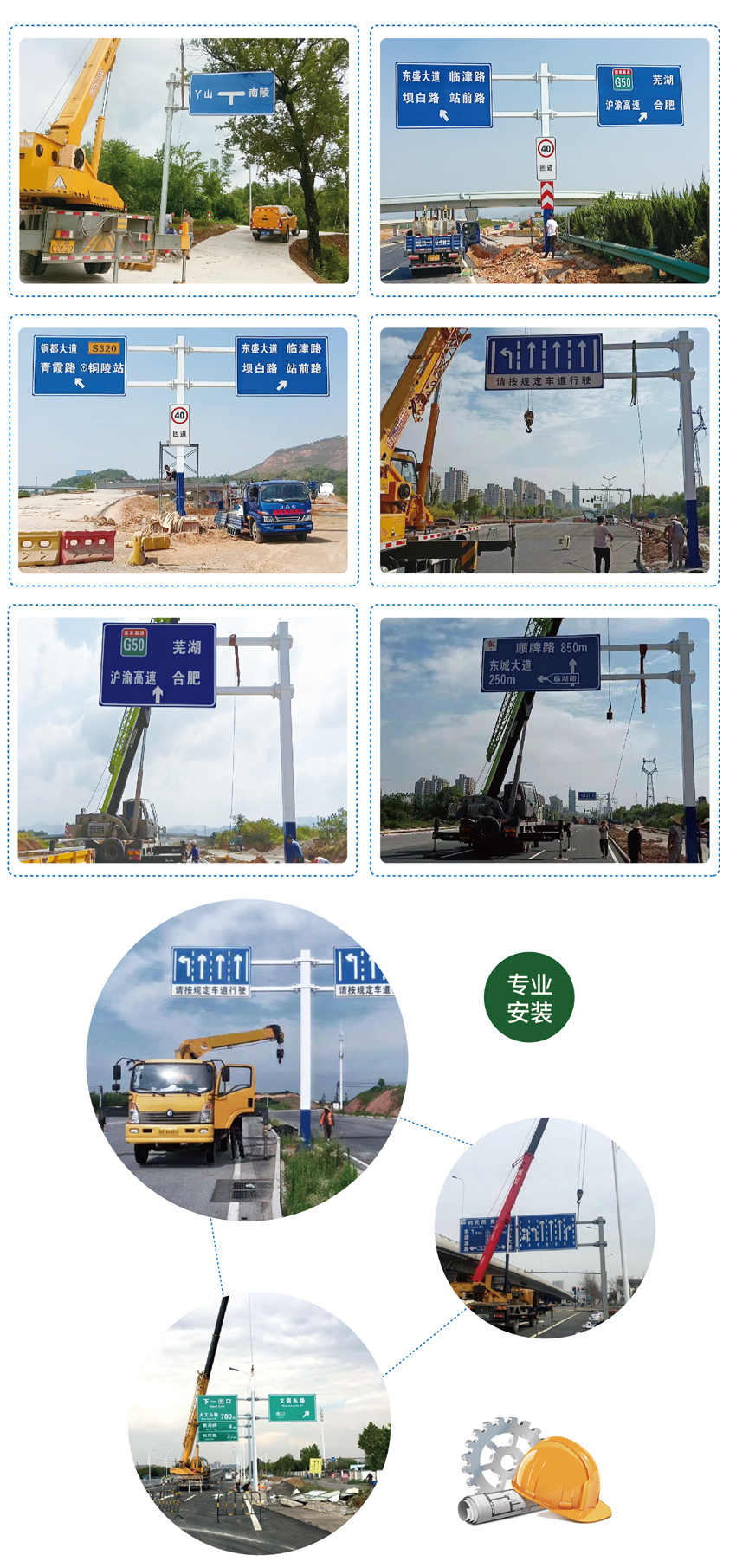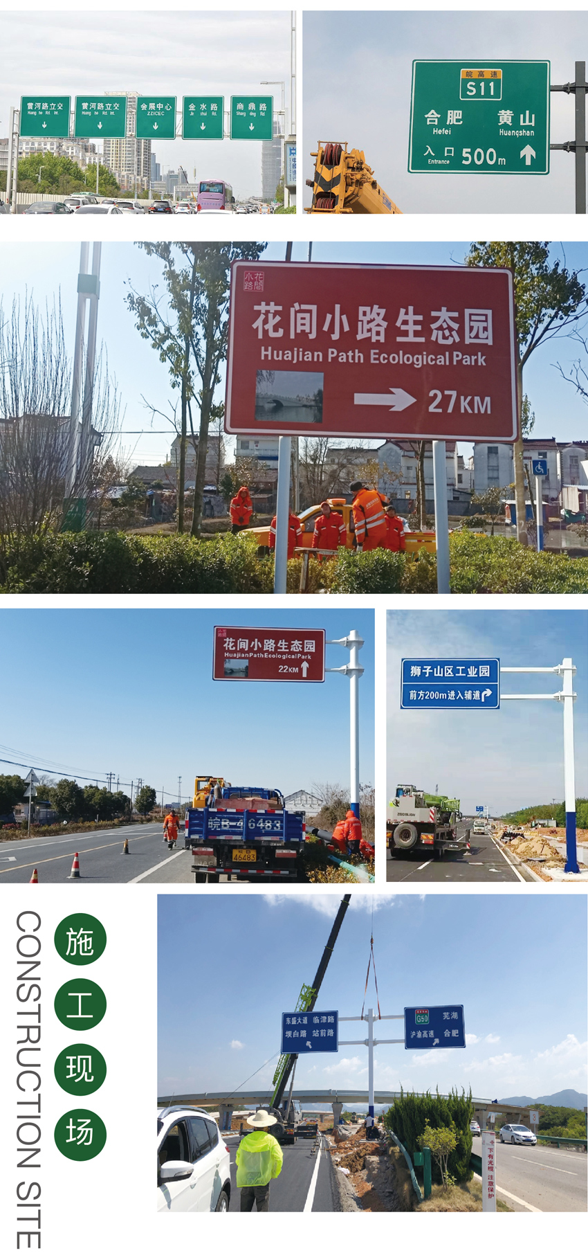 起指路作用。传递道路方向、地点、距离信息的标志。颜色除里程碑、百米桩外,一般为蓝底、白图案;高速公路一般为绿底、白图案;形状除地点识别标志、里程碑、分合流标志外,一般为长方形和正方形。设置在需要传递道路方向、地点、距离信息的路段或交叉口附近。